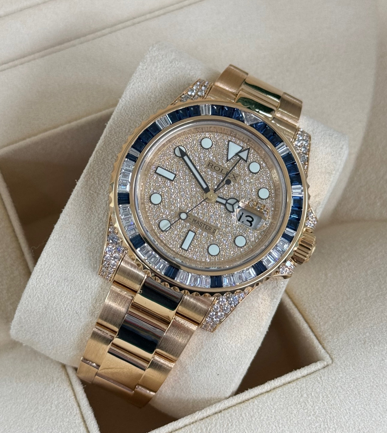 Rolex GMT-Master II Yellow Gold Sapphire / Diamond Bezel & Pave Dial (ref. 116758SABR)
